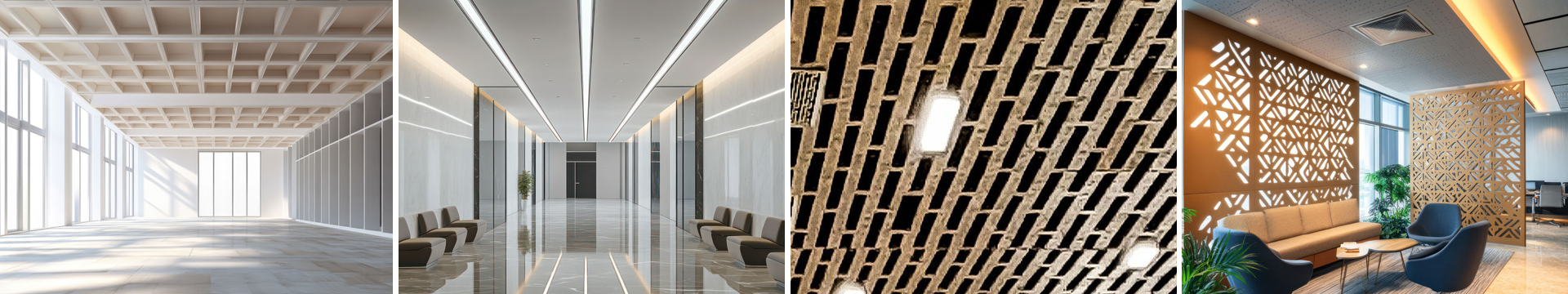Exhibit cutting-edge materials like gypsum, metal, PVC, and smart ceiling solutions for modern interiors.
